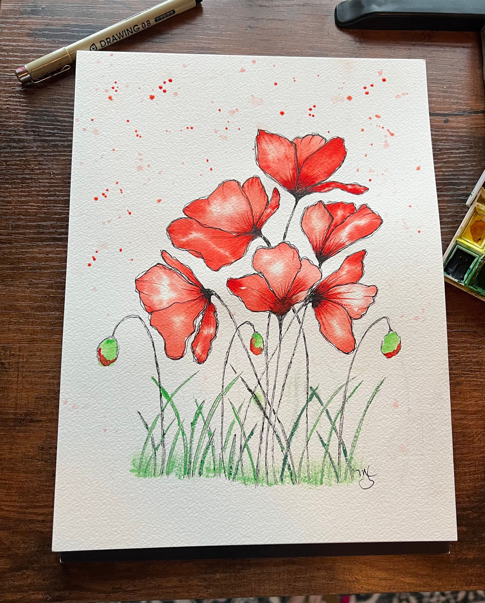 Vibrant paintings of flowers on textured and white paper, with green grass and sunflowers depicted in the artwork.